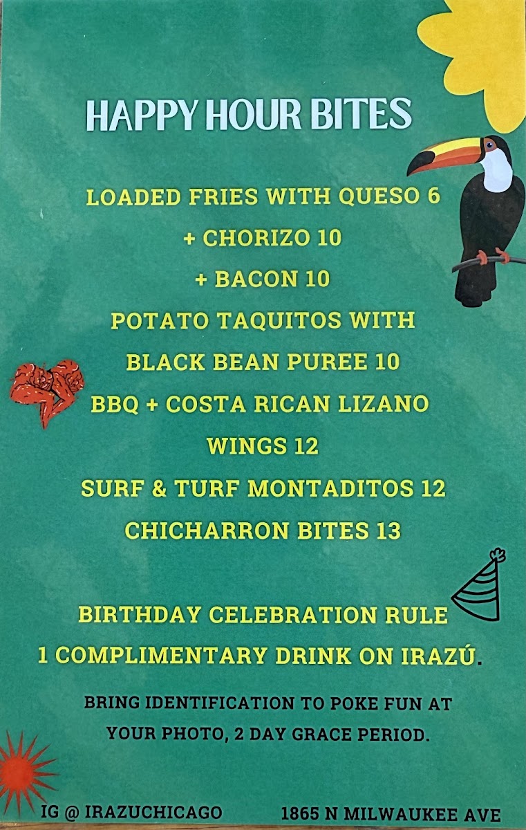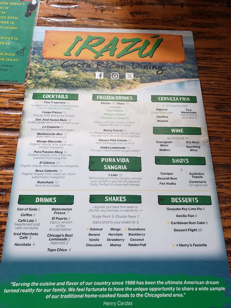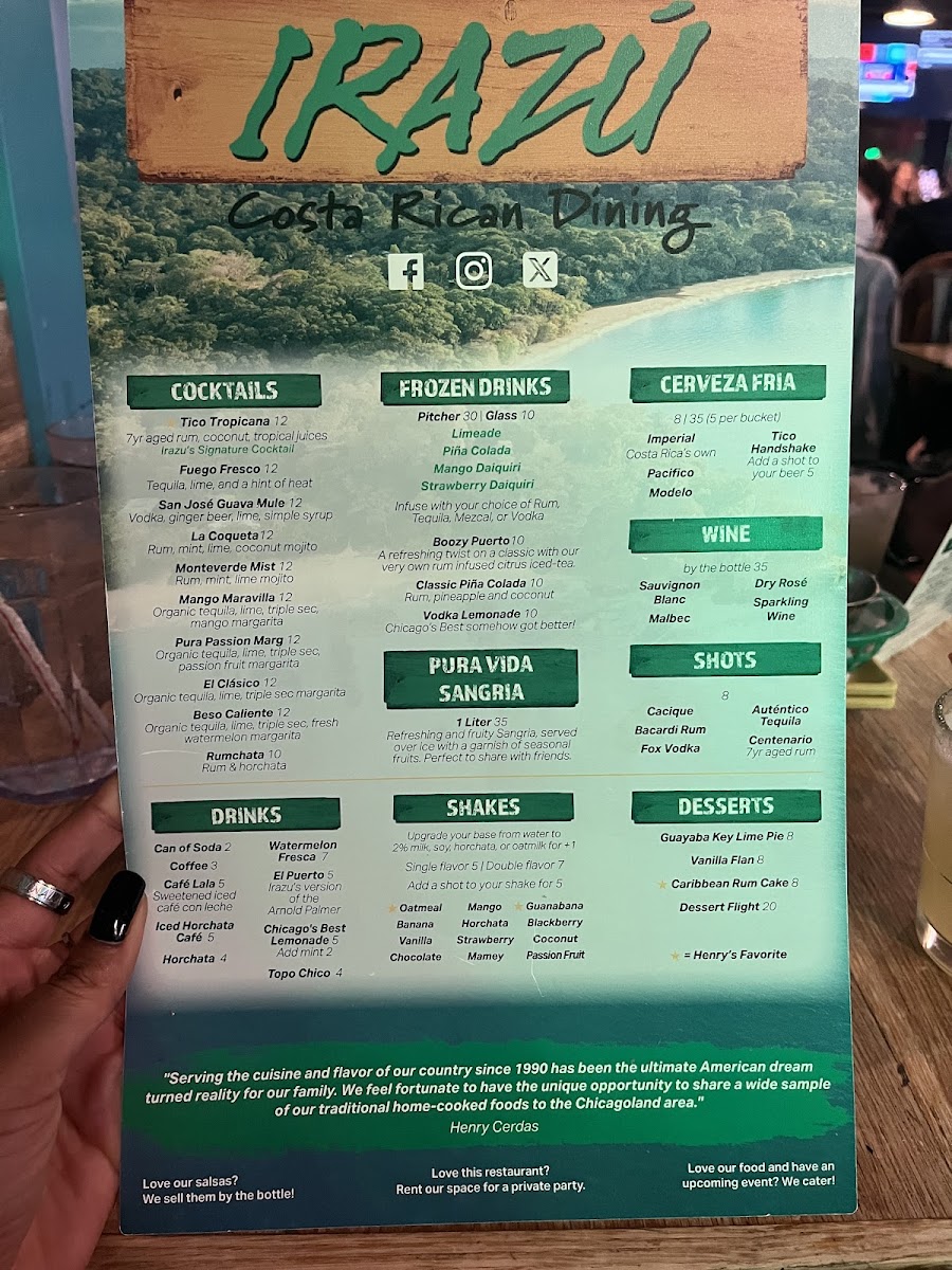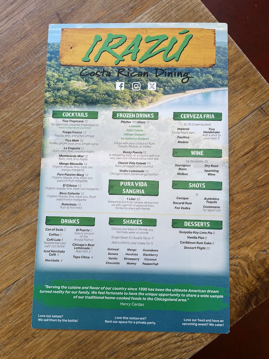 At Irazu Costa Rican Restaurant & Catering, the menu brings the vibrant flavors of Costa Rica straight to Chicago. Whether you're craving a hearty Casado, a flavorful ceviche, or the iconic Arroz con Pollo, every dish is crafted with care and authenticity. You'll find a variety of mouthwatering options that blend fresh ingredients with traditional spices, offering a perfect balance of bold and comforting flavors. From the sizzling grilled meats to the rich, comforting soups, each plate tells a story of Costa Rican heritage. Paired with a refreshing tropical drink or one of their signature cocktails, a meal at Irazu is a celebration of taste. The Irazu Costa Rican Restaurant & Catering Menu reflects the warmth and hospitality of Costa Rica, making it the perfect spot for a casual meal or special occasion.
